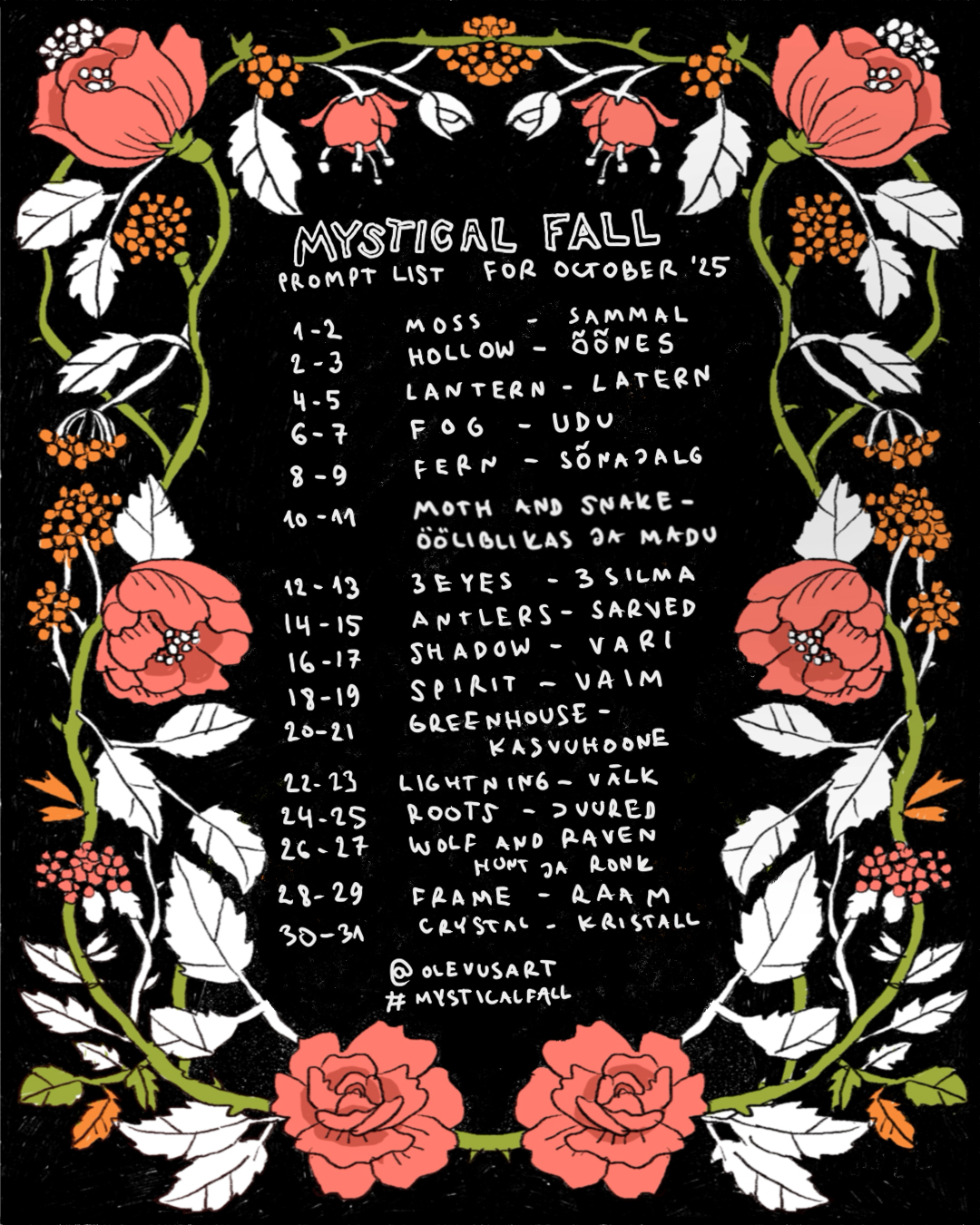 In Octobers I’ve taken part of different drawing challenges – from Inktober to Oculustober and Calmtober, hosted by different creative people. This year, 2025, I made my own prompt list called Mystical Fall. Here are the results of my own drawing challenge : )